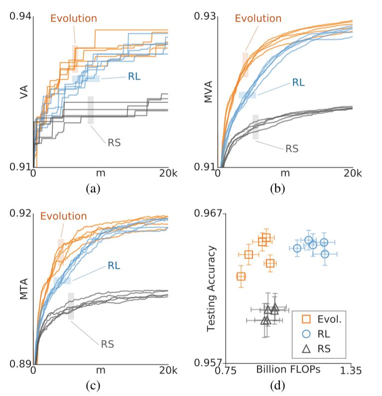 大规模的实验过程图表明,强化学习和进化算法都接近一般精度渐近线,所以我们需要关注的是哪个算法更快到达。图中显示强化学习要用两倍的时间到达最高精度的一半,换句话说,进化算法的速度大约比强化学习快一倍。但是我们忽略了进一步量化这一效果。另外,搜索空间的大小还需进一步评估。大空间所需专业资源较少,而小空间能更快更好地获得结果。因此,在较小空间中很难区分哪种搜索算法更好。