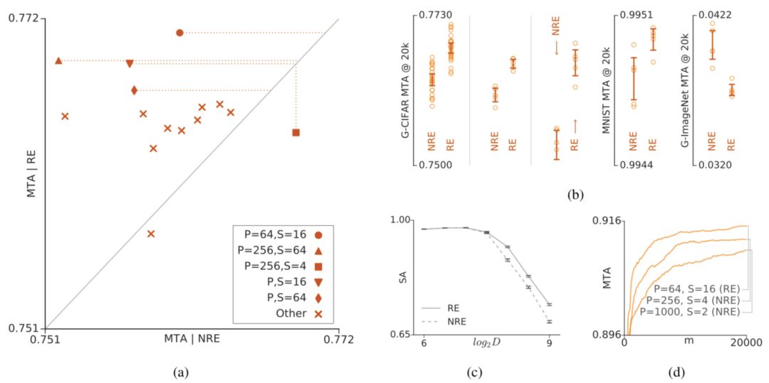 正则化与非正则化进化的对比。(a)表示在G-CIFAR数据集上非正则化进化和正则化进化用不同的元参数进行的小规模实验结果对比。P代表样本数量,S代表样本大小。(b)表示NRE和RE在五种不同情况下的表现,从左至右分别为:G-CIFAR/SP-I、G-CIFAR/SP-II、G-CIFAR/SP-III、MNIST/SP-I和G-ImageNet/SP-I。(c)表示模拟结果,竖轴表示模拟的精确度,横轴表示问题的维度。(d)表示在CIFAR-10上进行的三次大规模试验。
