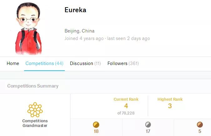 而在 Kaggle 排行榜上,有一位中国选手,面对如此激烈的竞争,一举杀入前五,最高排名第三。他就是目前在排行榜上位列第四的 Eureka(Eureka Kaggle 主页:https://www.kaggle.com/pengyan)。