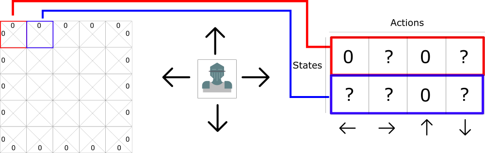 在我们探索环境(environment)之前,Q-table 会给出相同的任意的设定值(大多数情况下是 0)。随着对环境的持续探索,这个 Q-table 会通过迭代地使用 Bellman 方程(动态规划方程)更新 Q(s,a) 来给出越来越好的近似。