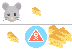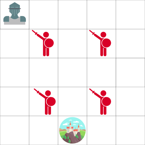 你每次可以移动一个方块的距离。敌人是不能移动的,但是如果你和敌人落在了同一个方块中,你就会死。你的目标是以尽可能快的路线走到城堡去。这可以使用一个「按步积分」系统来评估。