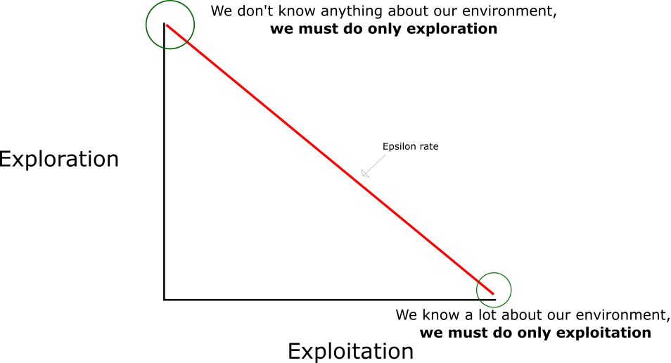 在刚开始训练 Q 函数时,我们必须有一个大的 epsilon。随着智能体对估算出的 Q 值更有把握,我们将逐渐减小 epsilon。