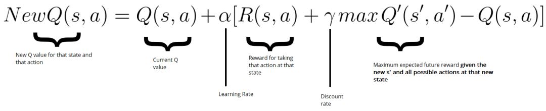 lr * [Reward + discount_rate * (highest Q value between possible actions from the new state s’ ) — Current Q value ]