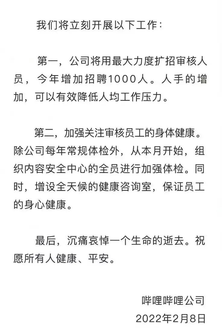 【B站再次回应员工猝死:审核人员扩招1000人】8日深夜,B站在微博再次回应“员工春节加班猝死”事件,目前公司方面已与家属沟通好善后事宜,并立刻对审核人员进行扩招,同时加强关注审核员工的身体健康。(财经网)