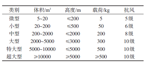 军事上应用的系留气球系统一般都部署在野外,无球库之类的遮蔽设施,所以抗风能力是一项重要指标。不同的气球因体积、构型、环境适应性等要求的不同,其抗风能力大相径庭。小型的系留气球系统锚泊设施相对简单,系缆及球载系统追求轻便,抗风能力较弱,但其部署方便,可以根据天气预报情况快速撤收,避免大风对其造成损坏。中大型系留气球系统的锚泊设施、系缆、连接件结构等强度较高,具备整体较高的抗风能力。根据体积大小,系留气球分类及其性能如表1所示。