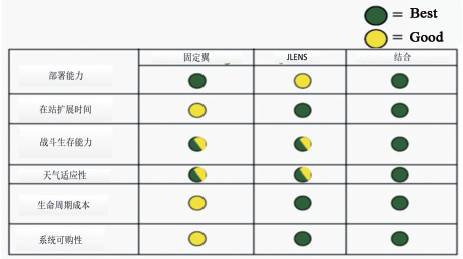 图14在部署能力、定点续航时间、战场生存能力、天气依赖性、生命周期成本、系统负担能力等方面将JLENS系统与固定翼飞行器进行对比,如果能与固定翼飞行器联合组网将达到最佳效果。