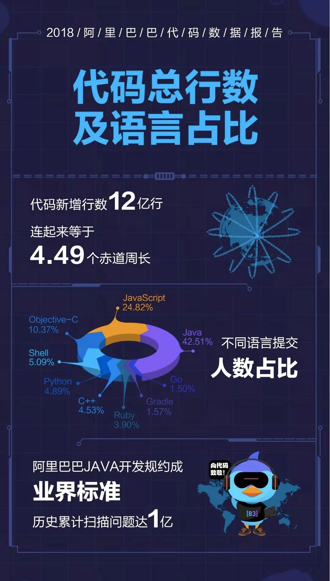 近日,《阿里巴巴代码数据报告》正式发布。报告显示,阿里工程师在2018年共写下了12亿行代码,总代码长度可绕地球4.49圈。
