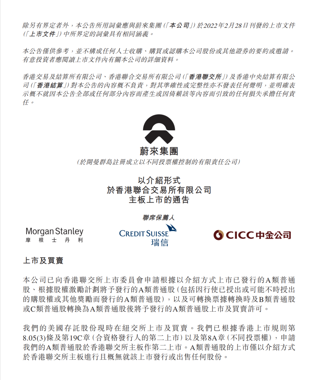 港交所文件今日披露,蔚来集团申请在香港联交所主板上市。联席保荐人为摩根士丹利、瑞信和中金公司。A类普通股预期将于2022年3月10日(星期四)开始在香港联交所买卖。