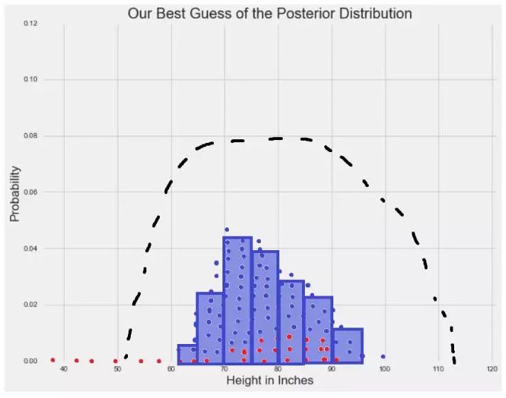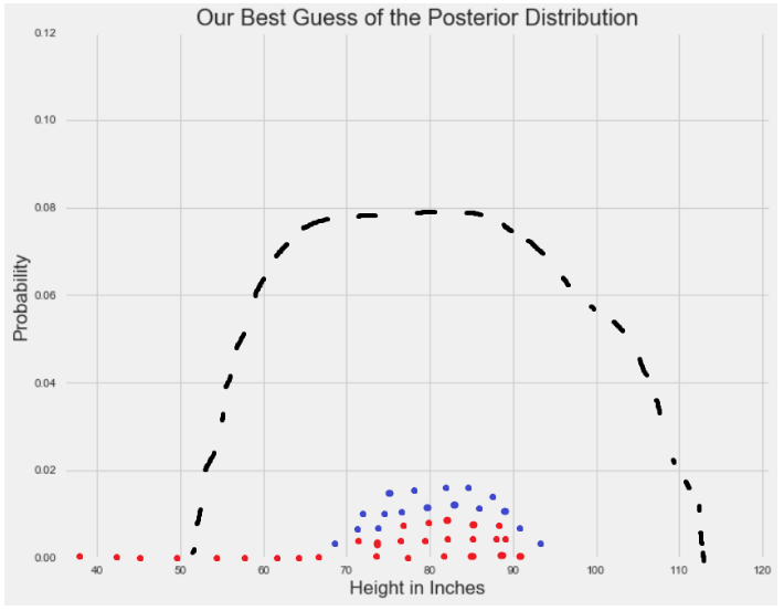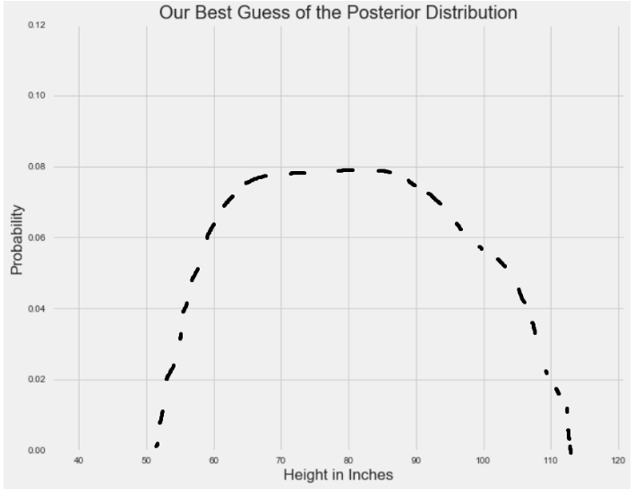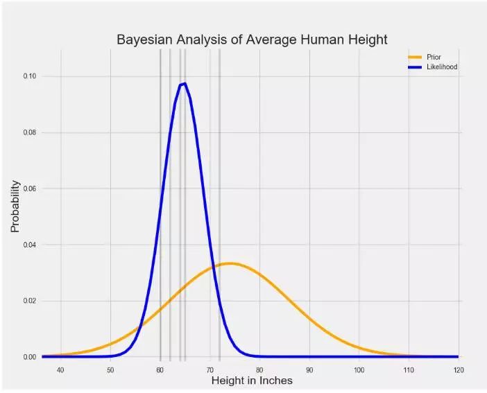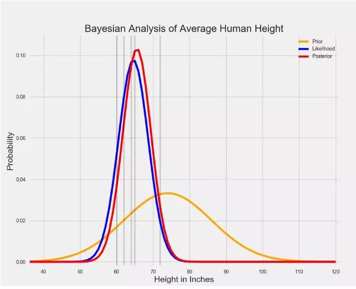 当先验和可能性结合在一起时,数据(可能性分布表示)弱化了个体在巨人中长大的可能性。 尽管那个人仍然认为人的平均身高比数据告诉他的稍高一些,但是他最相信的还是数据。