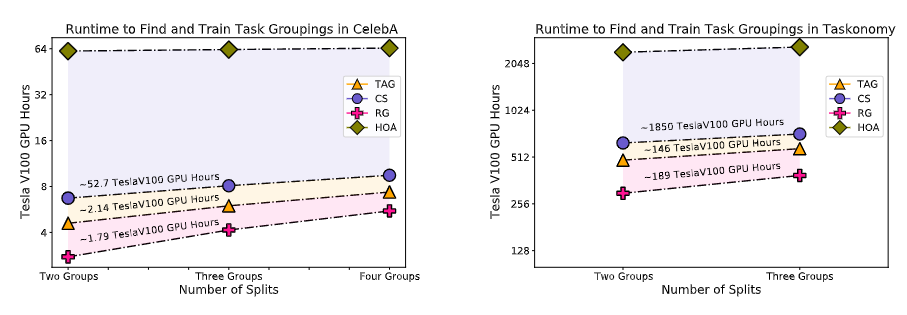 实验结果表明,TAG可以选择出强相关的任务组。在Celeba和TaskOnomy数据集上,TAG和sota模型相比运行速度的提升分别为32倍和11.5倍。