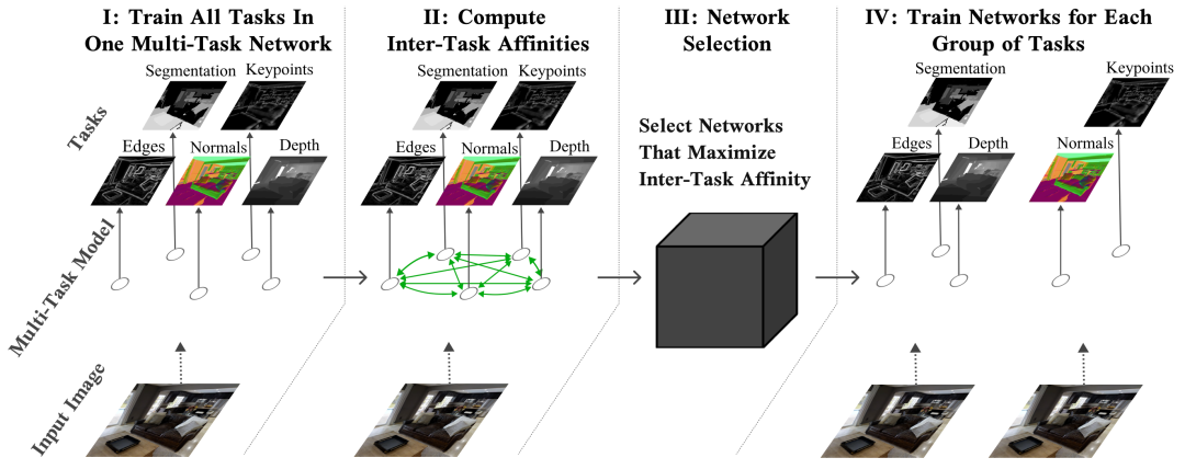 网络选择算法可以利用这个信息将任务分组在一起,以最大化任务间的亲和力,这也取决于从业者在推断过程中可以使用多少多任务网络。