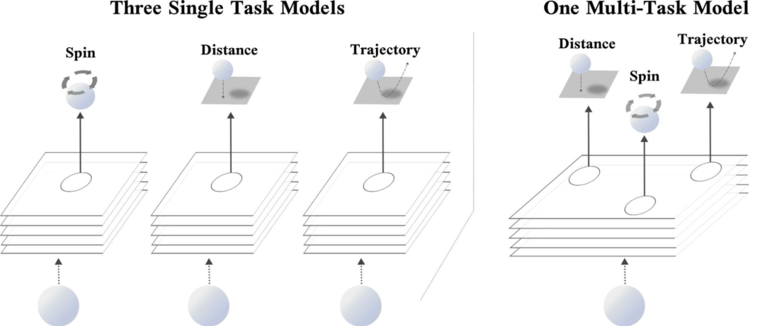 但如果能同时预测好乒乓球的旋转和位置,则对于更好地推理出乒乓球的预测轨迹来说一定是有帮助的。所以如果一个深度学习模型能够同时训练并预测这三个任务,那肯定比单独预测三个任务来说准确率更高。
