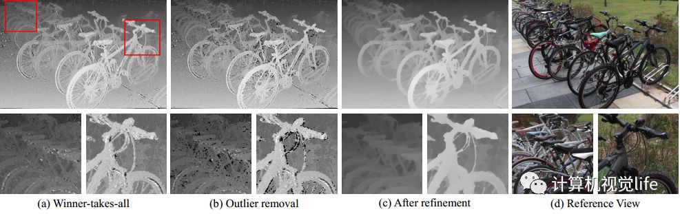 (a) 用赢家通吃的策略得到一个粗糙的深度图;(b) 去除不可靠的深度值;(c) 深度图精细化后的结果;(d) 参考图像。