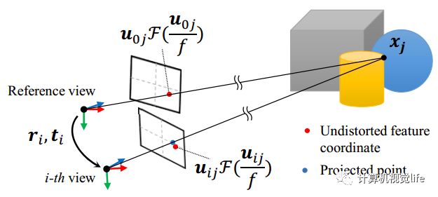 2、先假设初始的相机内参和畸变参数,利用光束平差法最小化重投影误差,迭代得到相机的内外参数、特征点对应的三维空间点。其原理示意图如下所示。Uij是第i张图像相对于图像中心的第j个特征点的畸变坐标,红色点是其去畸变后的坐标。蓝色点是重投影的坐标。目标就是最小化第i帧中红色点和蓝色点的位置误差。