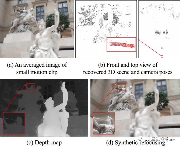 下面来介绍该技术的一个应用。如下图所示,(a) 是输入的一个微运动视频中所有帧的平均叠加图,可以看到运动真的是非常微小的。(c) 是算法计算的深度图,从放大的细节来看,边缘还是很锐利的,(d) 是利用得到的深度图进行重对焦的效果。我们看到对焦主体比较清晰,而位于主体前后景深的物体都已经虚化。