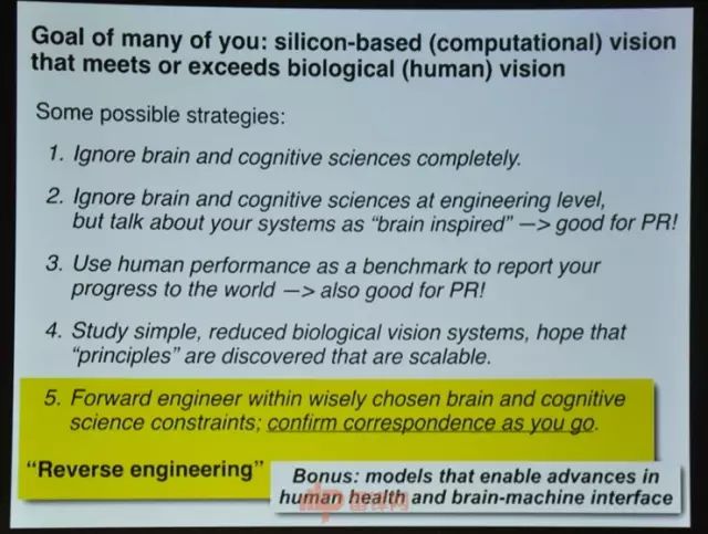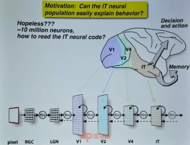 教授的研究内容是人类的大脑,研究它是如何工作的、如何用计算的方式模拟它;而CV界的研究目标则是尝试构建出达到人类大脑表现的系统。所以在教授看来,希望CV界的人也能够从神经科学的研究中受益。