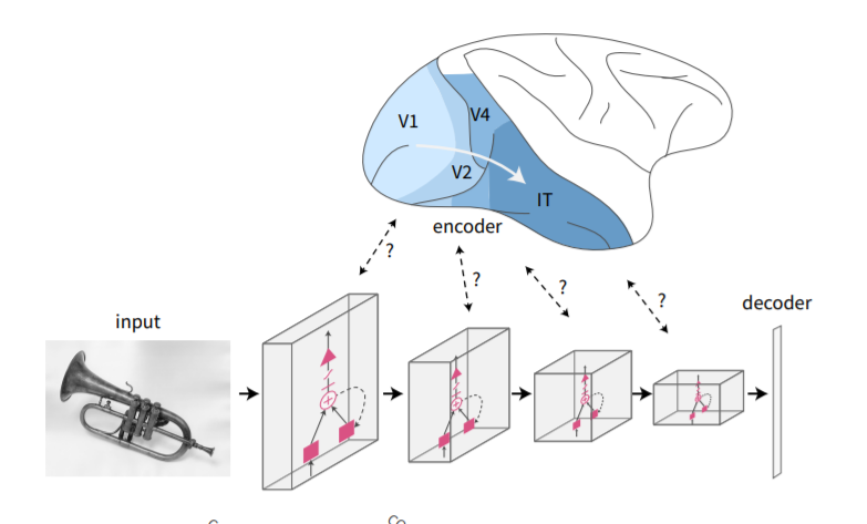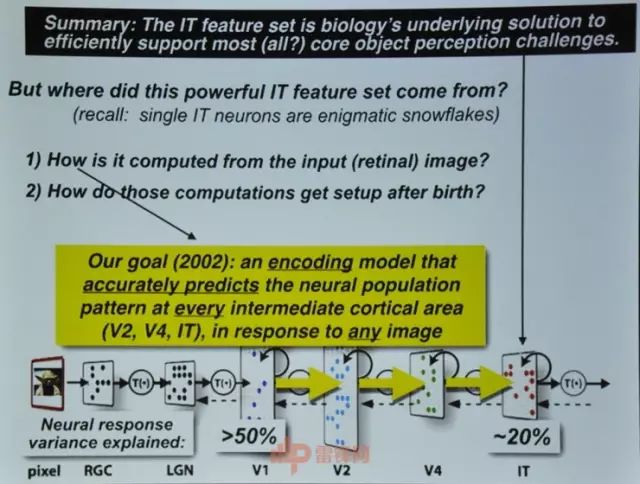 在了解了 IT 细胞的特性以后,更实际和更深入的问题也就来了:只有500个就够的 IT 神经细胞特征是如何形成的?它们是如何从视网膜信号的基础上逐步抽象的?在人类成长的过程中这些计算方法又来自哪里?如果能够研究清楚这些问题,也就对教授团队的目标有很大帮助。他们的目标就是想办法构建一个编码器模型,可以对任何一张图片、任何一个中间皮脂层都准确预测对应神经群的响应模式,刚刚的问题就是系统构成的关键问题。