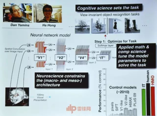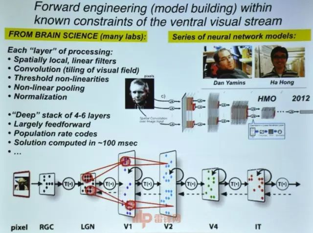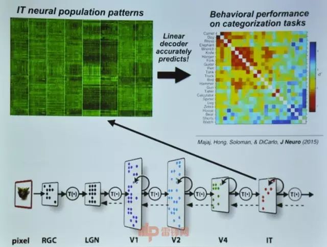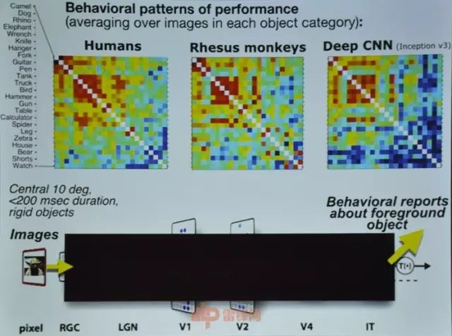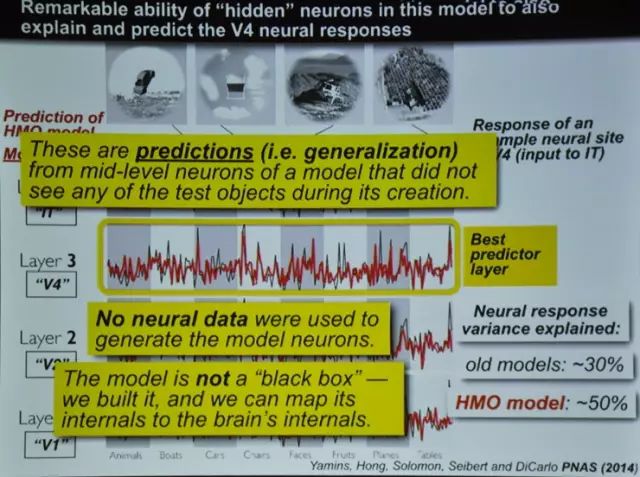 教授展示了这样一张图,在卷积神经网络研究的过程中,网络本身的物体识别能力是重要的性能指标,而实际上识别能力越强的模型也对 IT 响应的解释能力越好;HMO这样的模型在性能表现进化的同时,对IT表现的解释能力也达到了新高峰(2012年时)。