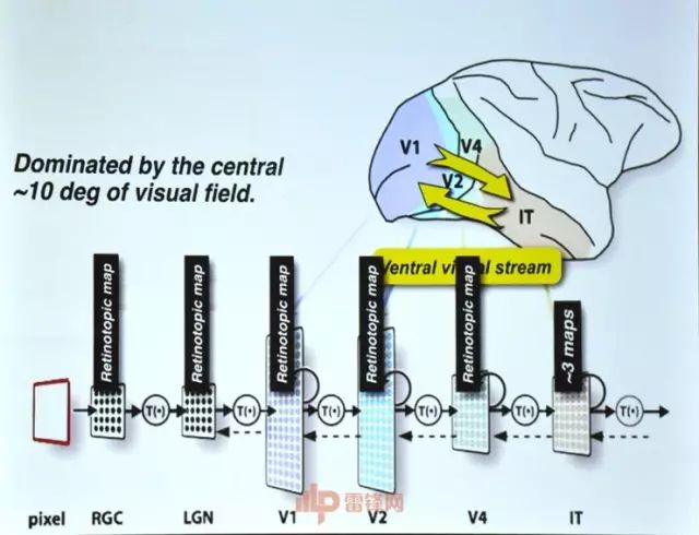 人类/灵长类的大脑视觉皮层已经有了很多研究成果,人们已经知道可以分成 V1、V2、V4、IT四个区域。整个视觉系统的工作流程图画出来的话就是图中这样,把视网膜上的细胞看作像素的话,外界的视觉刺激首先组成视网膜色谱图,然后经过视网膜级别的 LGN 以后依次来到大脑皮层的 V1、V2、V4、IT 区域,每个区域都有百万级别的细胞;然后每个区域与视网膜形成不同的区域对应特性,对输入信号的表征空间也逐步发生变化,人们也就是由此进行的划分,从而把视觉系统看作是一个深度分层网络。由于 IT 区域在最后,有最高的抽象级别,所以 IT 区域与视网膜的区域对应性也是最弱的,而在物体识别任务中对不同类别物体的响应模式也是最明确的。