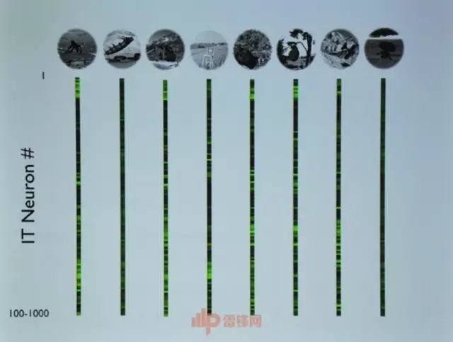 借助这样的方法, 关于 IT 中区域对图像的响应就可以构建非常高维的响应向量,如图中所示,大概在100到1000个神经细胞特征上测量得到的8个向量已经绘制成了图像的样子(长条),绿色表示响应高,黑色表示响应低。他们测量了2000个种类图像的向量,没有测试更多种类的原因是用类似的特征做了50次左右的反复测量以获得非常高的信噪比。