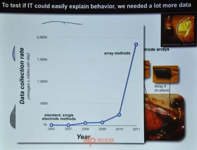 在这里,教授再一次提到了在动物大脑内手术植入电极。通过不同区域多个电极、每个电极可以采集96个通道(96针)的信号、做大量实验的方法,对IT等部位构建了维数非常高的数据空间。获得的数据量相比以前单电极的时代也有着爆炸性的提高。
