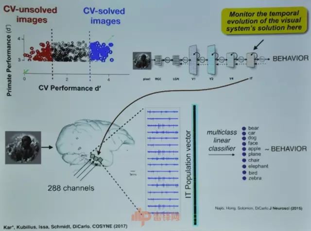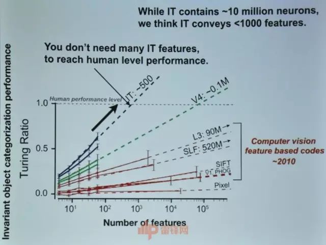 教授有一个有意思的发现:不需要测量太多的 IT 神经细胞特征就可以达到人类的表现,大约500个左右就够。同时代的计算机视觉模型中每个特征对模型表现的贡献就要小很多,很多的特征才能达到近似人类的表现。这说明了动物的视觉理解能力可能就是由一个维数不算高的特征集支撑的,计算模型就可以用这样的思路进行模仿。IT 大概含有一千万个输出神经细胞,但是传递的特征维数也就不到1000个。