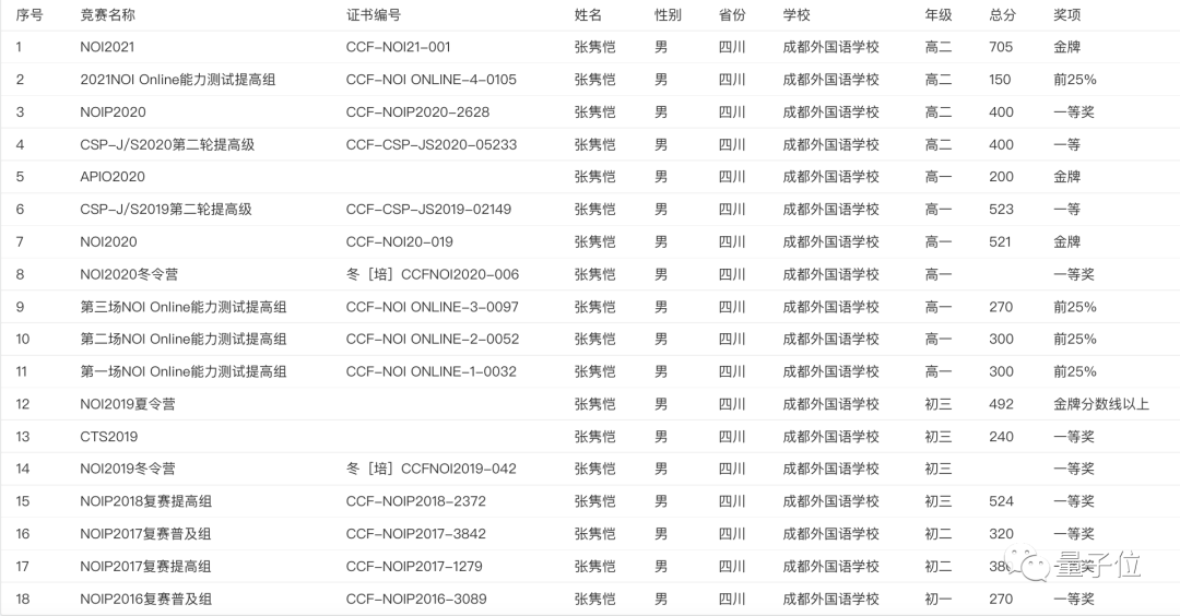 张隽恺初高中均就读于成都外国语学校,初中起就开始参加各级各类数学、信息学竞赛。