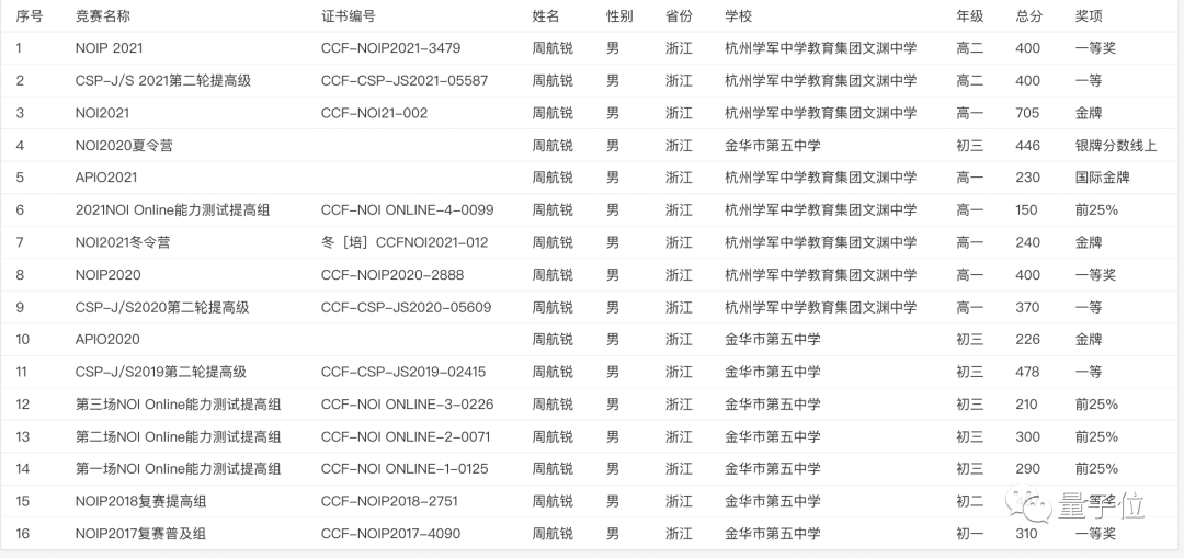 去年,周航锐参加 NOI ,先是成为浙江赛区唯一满分学生(也是全国唯一获满分的高一学生),最后获得了金牌,与此次IOI 2022中国队队友、同获金牌的张隽恺并列全国第一。