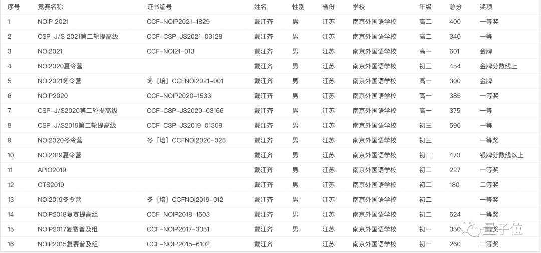 小学四年级,戴江齐开始学习信息学,四年级升五年级时就曾在省级比赛中获奖。