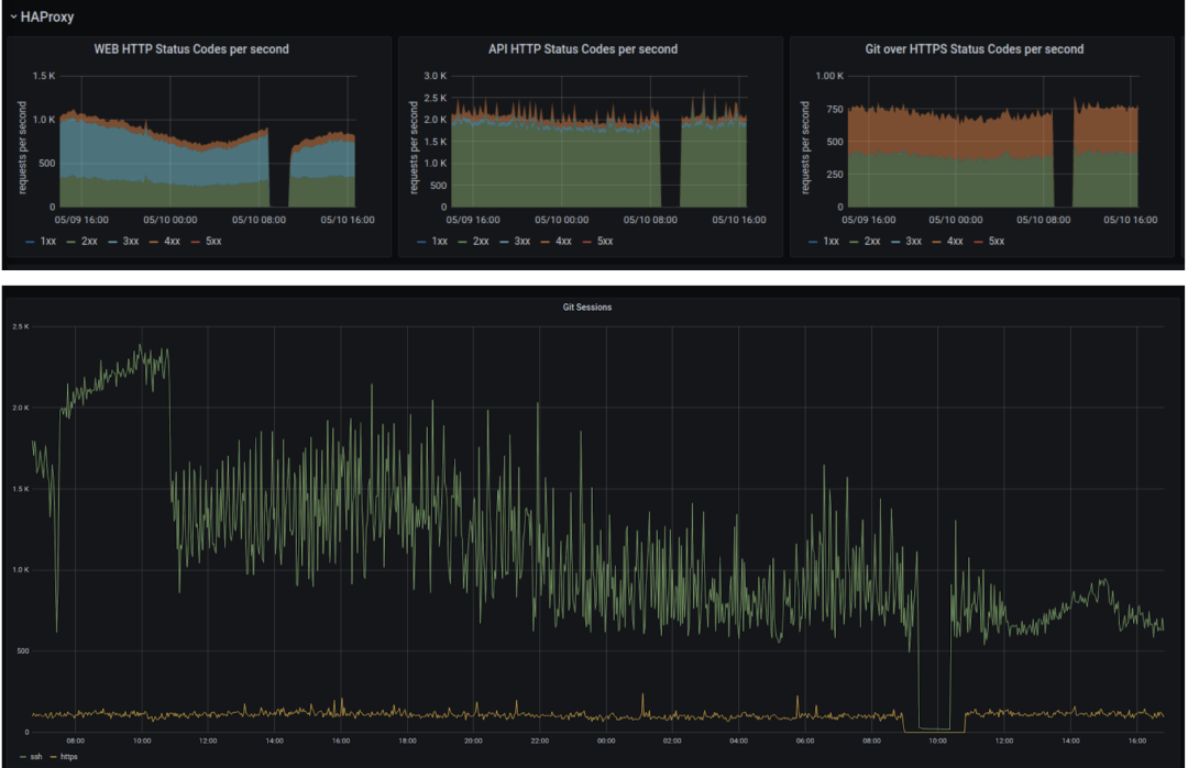 下面图表显示在服务更新之前,维护期间(图标中的空白部分)、以及维护结束、流量恢复后的流量和 HTTP 数据统计。