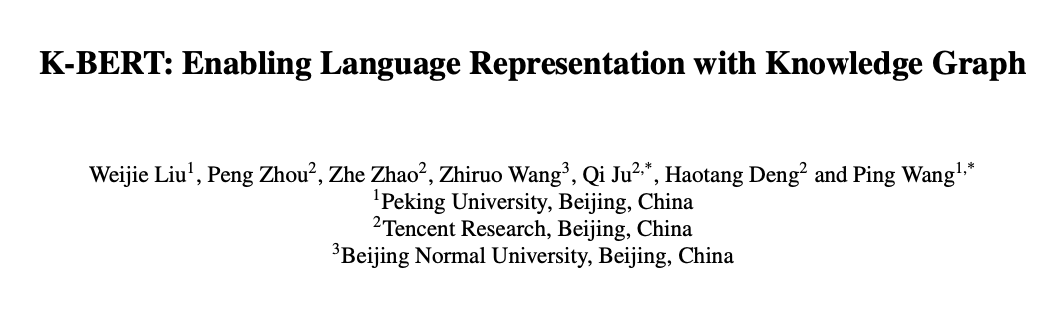 Weijie Liu等人的工作(北大、腾讯和北师大共同完成),提出了一个称为K-BERT的模型,它假设了每个句子(如果有可能)都会用知识图谱中的一个命名实体或关联对来标注。