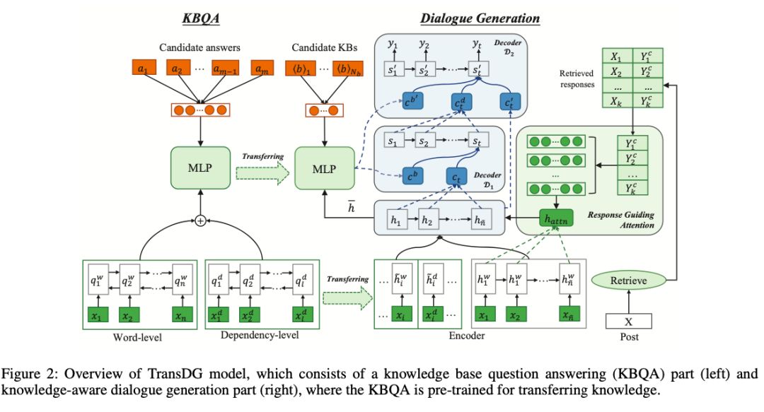 西南科技大学、中国科学院、腾讯 AI Lab等机构联合发表的论文中,提出了一种被称作TransDG的模型,可用于闲聊对话机器人的回应生成,其中主要的方法是,从在SimpleQuestions、Freebase和 ConceptNet数据集上经过训练的 KGQA 系统迁移事实知识。