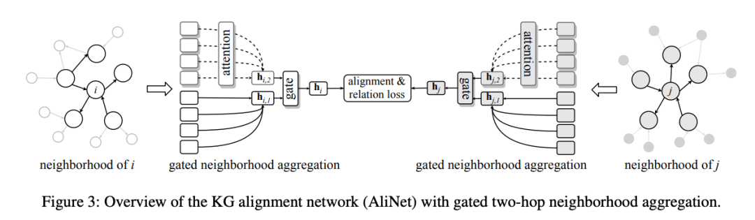 Sun等人提出了AliNet模型,这是一个端到端的基于GNN的框架,能够为实体对齐聚合远程多跳邻域。由于模式异质,这个任务变得更加复杂,因为不同知识图谱中相似实体的邻域不是同质的。