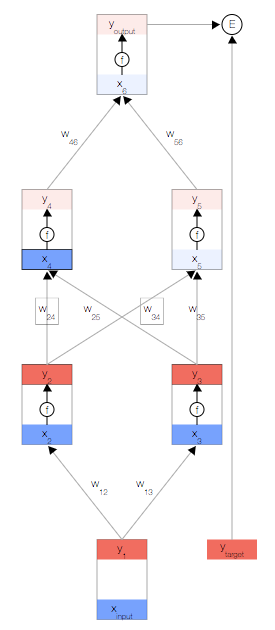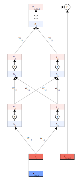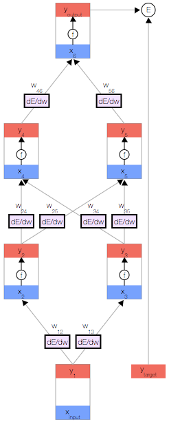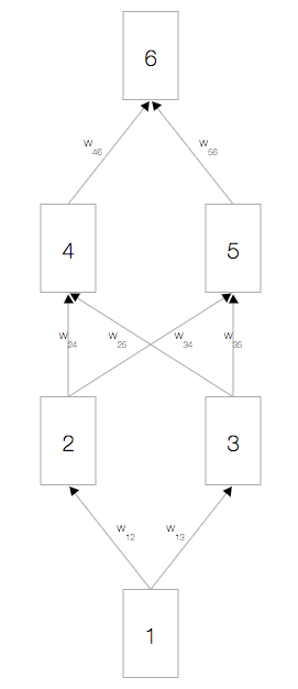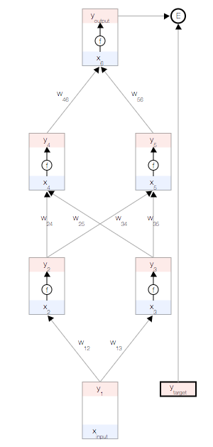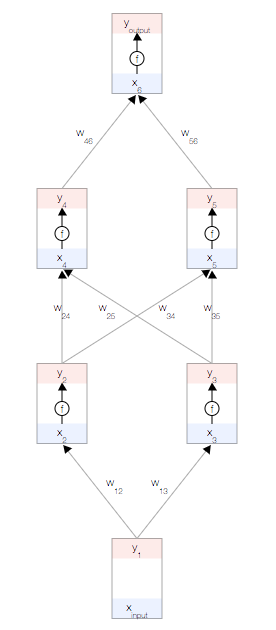 如上图,你会看到一个神经网络,其中包含一个输入节点、一个输出节点,以及两个隐藏层(分别有两个节点)。