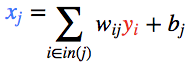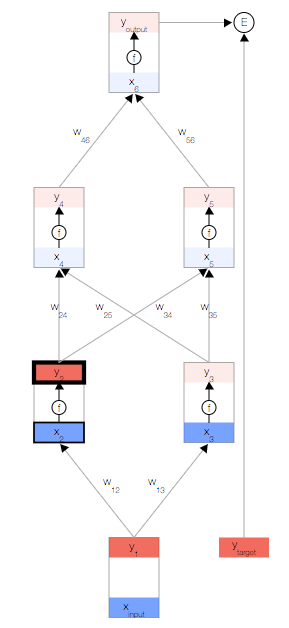 现在,我们更新第一个隐藏层。我们取上一层节点的输出 y,并使用权重来计算下一层节点的输入 x。