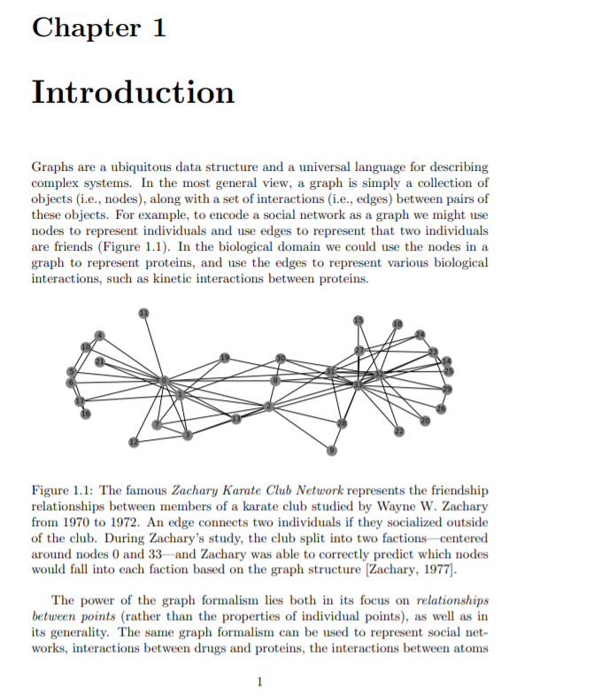 图是一种普遍存在的数据结构和描述复杂系统的通用语言。在最普遍的观点中,一个图仅仅是对象的集合。,以及一组交互(例如,节点)。(边)在这些对象对之间。例如,为了将一个社会网络编码为一个图,我们可以使用节点来表示个体,使用边来表示两个个体是朋友(图1.1)。在生物领域,我们可以使用图中的节点来表示蛋白质,并使用边缘来表示各种生物相互作用,例如蛋白质之间的动力学相互作用。