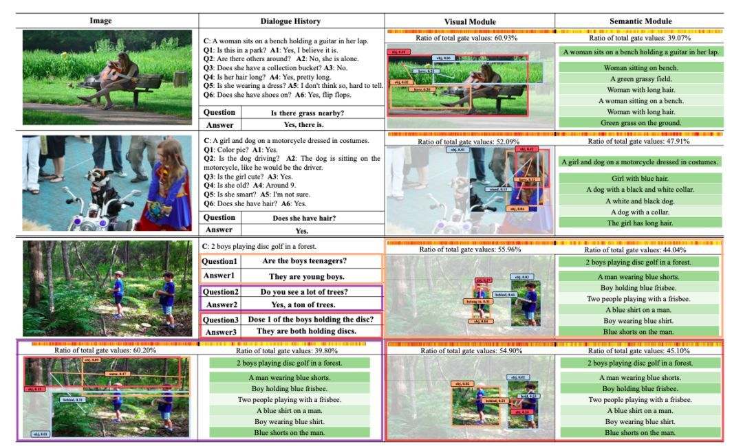 视觉信息将为回答问题提供更重要的依据。作者根据结果发现,视觉模块的累积 gate value 总是高于来自语义模块的累积 gate value, 此现象说明在视觉对话任务中图像信息在回答问题时扮演更加重要的角色,对图像信息更准确、更全面的理解对于提升模型的对话能力至关重要。