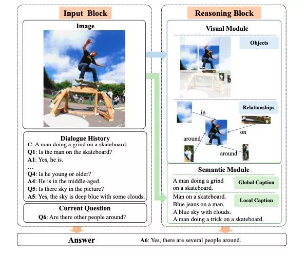 如下图 1 所示「Q1: Is the man on the skateboard?」, 需要关注「man」,「skateboard」等信息,当问题变换为「Q5: Is the sky in the picture」时,需要将关注区域转移至「sky」。问题 Q1 和 Q5 主要关注在表层(appearance-level)信息问题,而 Q4「Is he young or older」则需要进一步地视觉推理得到更高层的语义信息。因此,