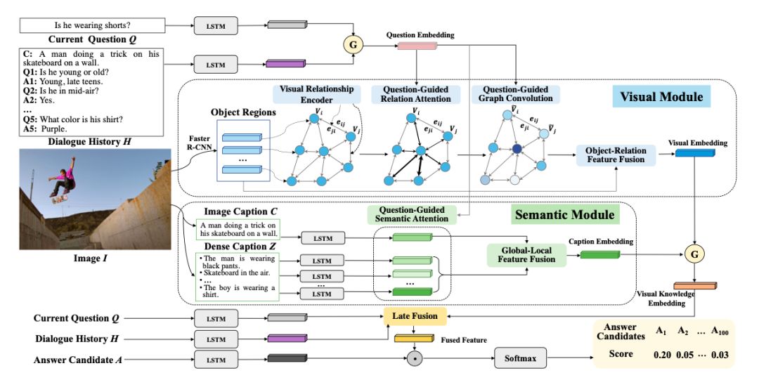 :语义模块描述图像的局部以及全局的高层语义信息,视觉模块描述图像中的对象以及对象之间的视觉关系。基于此框架,作者提出自适应视觉选择模型 DualVD(Duel Encoding Visual Dialog),分别进行模态内与模态之前的信息选择。