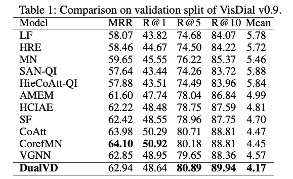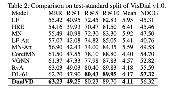 在 VisDial v0.9 和 VisDial v1.0 上对模型的效果进行了验证。与现有算法相比,DualVD 的结果超过现有大多数模型,略低于采用了多步推理和复杂 attention 机制的模型。
