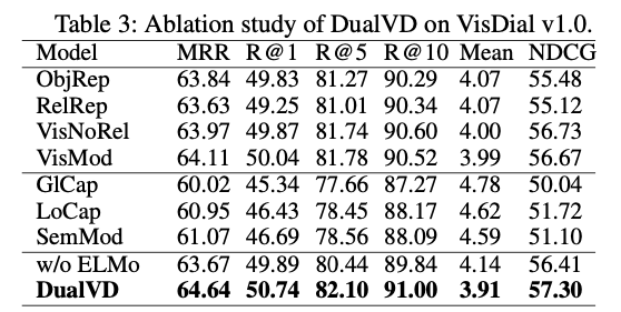 VisDial v1.0 验证集的消融研究利用了 DualVD 主要成分的影响。作者使用相同的 Discriminative decoder 做了充分的消融实验验证模型各个关键模块的作用, 如 ObjRep(目标特征)、RelRep(关系特征)、VisNoRel(视觉模块去掉关系嵌入表示) 、VisMod(完整视觉模块)、GlCap(全局语义)、LoCap(局部语义)、SemMod(语义模块)、w/o ElMo (不用预训练语言模型)、DualVD(完整模型)。