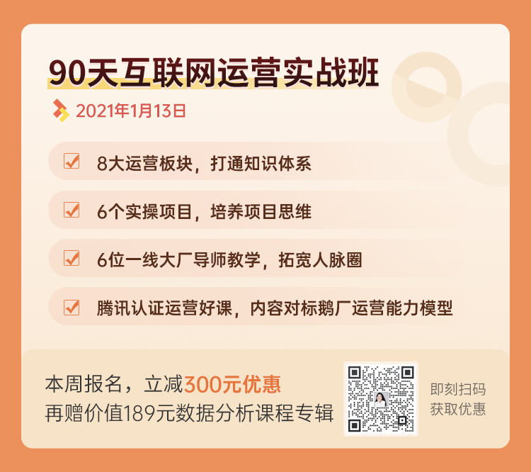 推荐腾讯课堂&起点课堂联合办学的《90天互联网运营实战班》直播课程,对标腾讯P6-P8运营人能力标准、可以成为你补充知识、补充项目、进大厂、自我提升的不二选择!