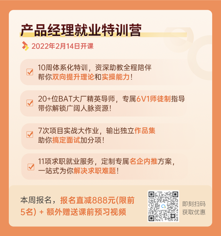 目前,特训营已帮助2000+小白/职场新人顺利入行就业产品经理,如果您也在入行/就业过程遇到难题,扫码免费获取一对一学习咨询服务,帮您做入行和学习规划!
