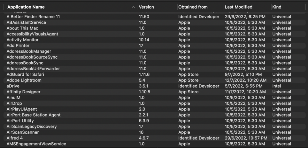 无论系统组件还是第三方 app,非 Universal 或者 Apple silicon 的反而比较少见,图中这个扎眼的「aDrive」是《阿里云盘》