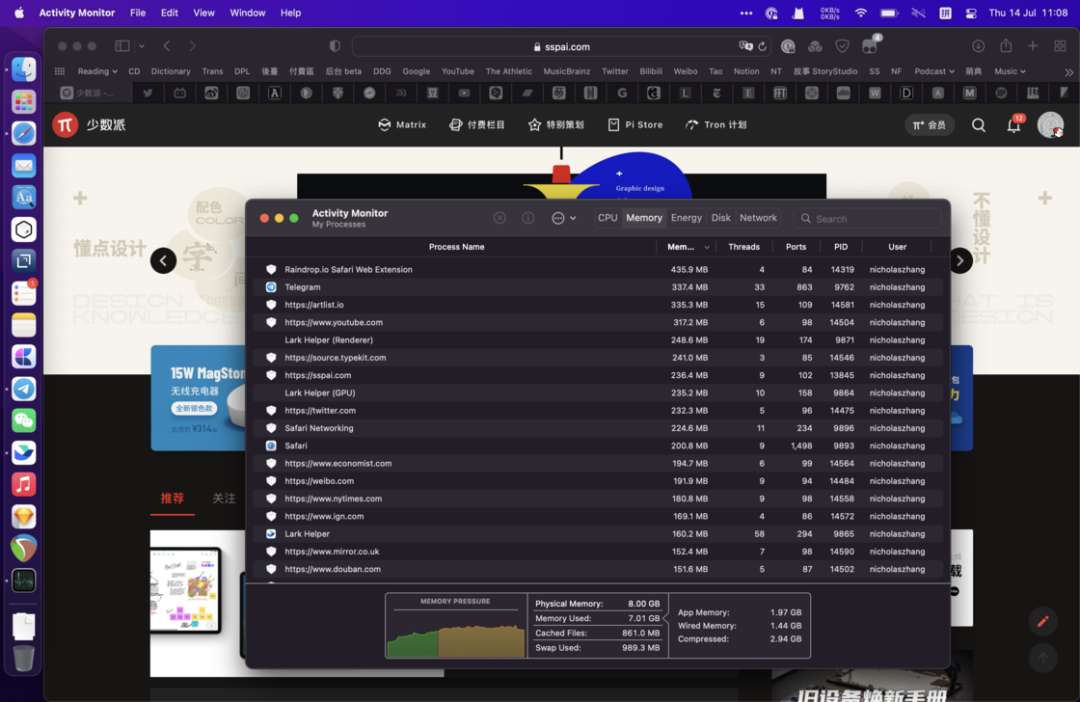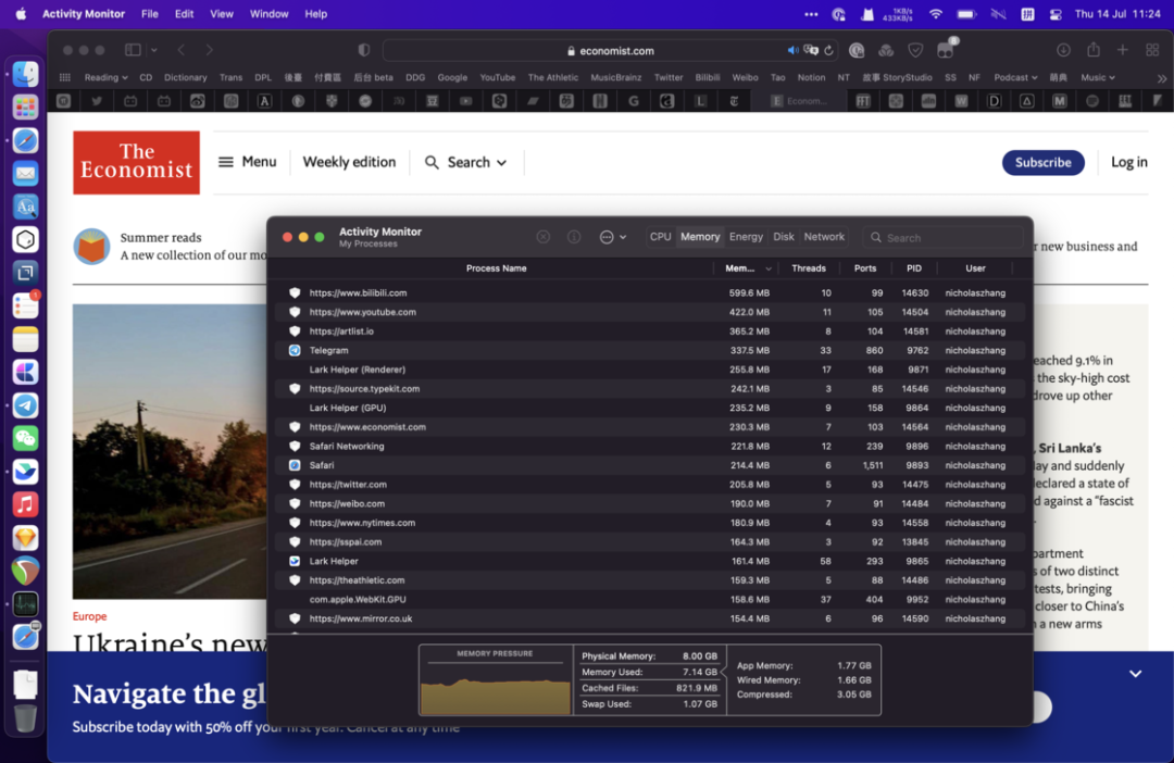 可能正是由于 Apple 设计的内存交换机制在起作用,才让疯狂多开标签页也不会无限增大内存压力。不过,这不代表 MacBook Air 就永不卡顿,或者 8GB 内存就够用到天荒地老。从我使用 M1 版 MacBook Pro 的经验来看,如果你需要在后台驻留大量 app,而且使用类似《Photoshop》这样狂吃内存的工具,那还是得考虑购买大内存版本,不然用个一年半载之后多少还是会遇到一些卡顿现象。