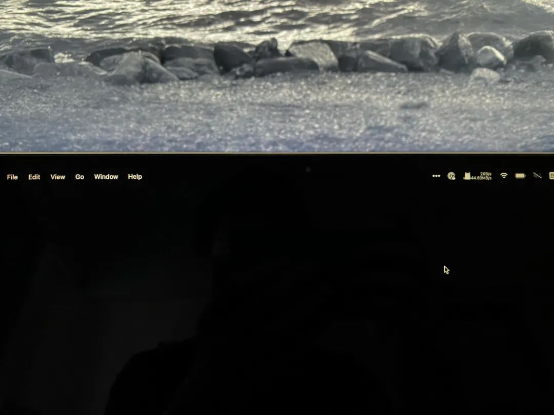但 MacBook Air 的「刘海」和 Pro 还有所不同,因为 Pro 系列使用了 mini-LED 屏幕,理论上可以比 Air 上的传统 LED 显示更高对比度,黑色的呈现也会更加深邃,可以通过使用深色背景的方式「隐藏」刘海。为了看看 Pro 上这招在 Air 上适不适用,我将新电脑的桌面壁纸设为纯黑,测试了 MacBook Air「隐藏」刘海的效果。