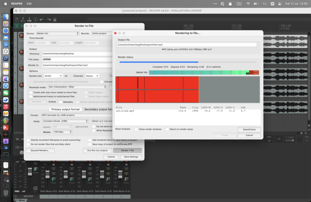 首先,我开启我常用的播客剪辑工具《Reaper》,导入 5 轨各 1 小时的声音素材,每轨挂载 5 个大型插件。我通常只需要用到 3 轨,每轨两三个插件,所以这样的配置和日常相比已经属于严重超载。其次,我准备了 4 部高码率的 4K 电影,外加一部 1080p 的《小时代》。准备完成后,我开启《Reaper》进行音频渲染,同时播放 5 部影片。在这样的状态下,M2 的 CPU 和 GPU 需要同时工作,并全部保持高压状态。