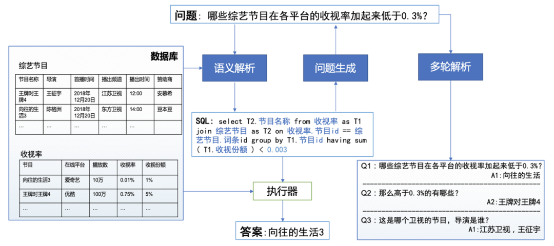 Text2SQL就是为了便捷访问数据库存在的一种技术,具体是指在给定关系型数据库(或表格)的前提下,根据用户的提问生成相应的SQL查询语句。上图给出了一个具体的实例,问题为:哪些综艺节目在各平台的收视率加起来低于0.3%?可以看到该问题对应的SQL语句是比较复杂的,需要同时对2个表格进行查询。