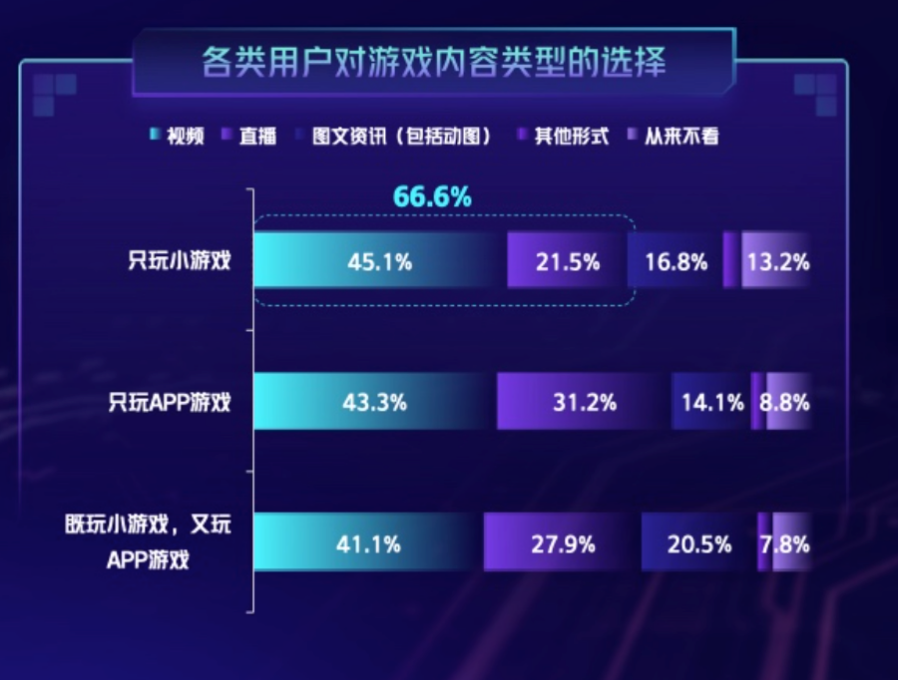 比如前面提到的短视频平台,根据抖音发布的《2022小游戏用户洞察报告》数据可以看出,小游戏用户的主要偏好是视频和直播,也就是说喜欢刷短视频看直播的用户和喜欢玩小游戏的用户高度重合。