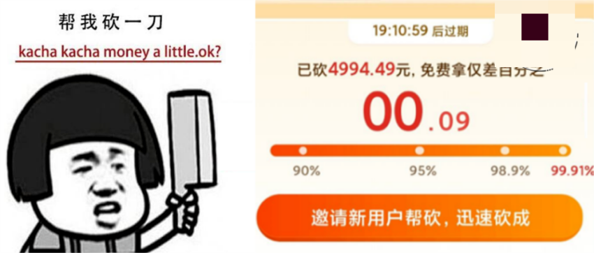 比如很多曾经大火的产品或者是产品功能都用到了游戏化思维,比如说拼多多的砍一刀,因为大家不知道砍一刀能看多少,而且一看砍了99.9%了不想放弃,于是疯狂转发,希望达成目标,没想到最后这0.0001%比登天还难。